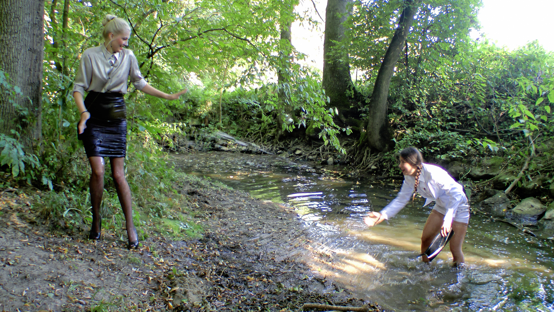If you go down to the woods today you're sure for a big surprise! Two sexy girls are teetering down a muddy bank in high heels towards a stream when the bitchy blonde pushes her brunette friend into the water! Tempers start running high as these gorgeous babes wrestle in the water and smear mud over each others clothes. Their tight skirts, sa...
