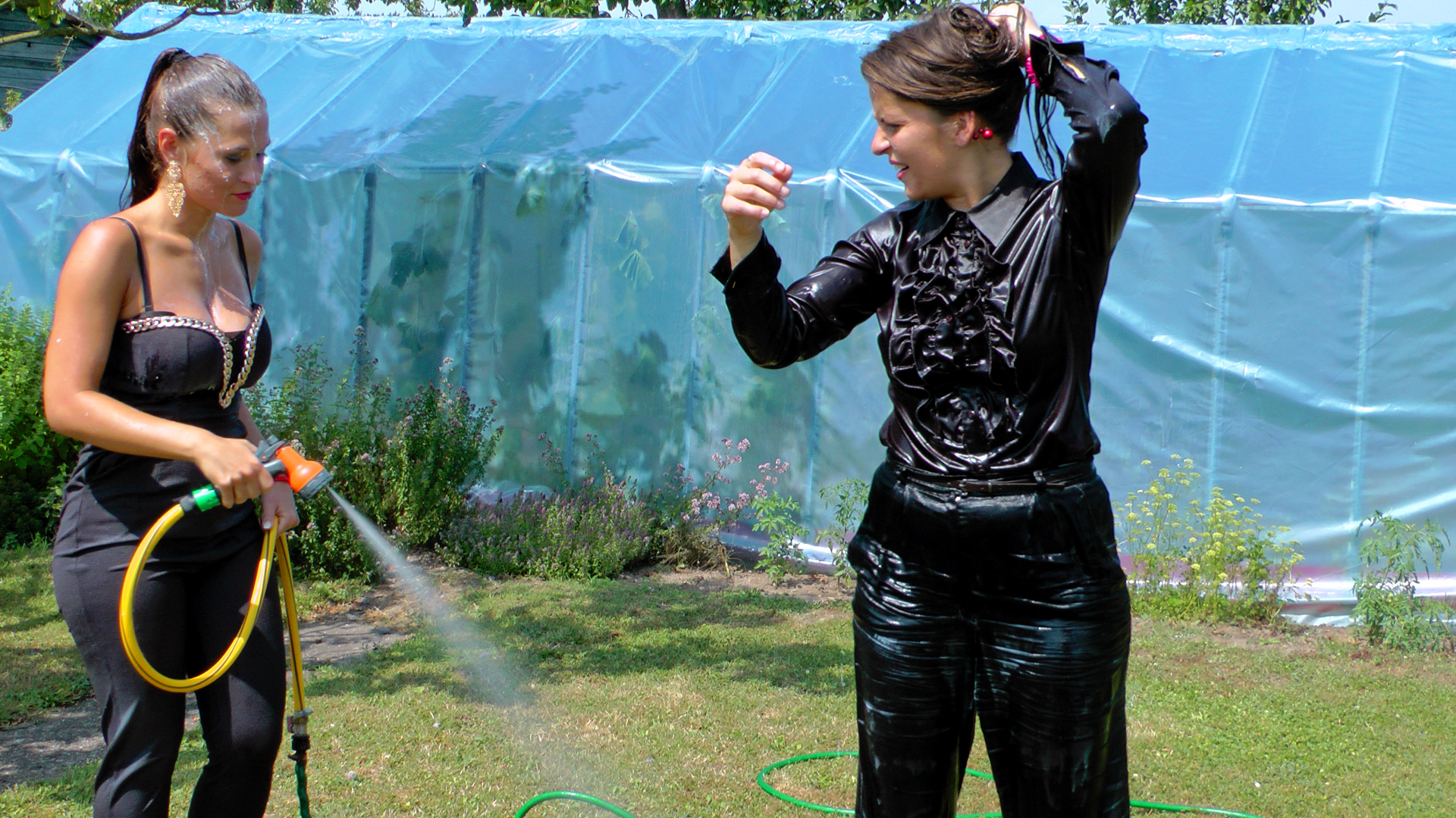 After getting drenched in milk there's nothing quite like a refreshing shower and that's just what these gorgeous brunette babes do! Outside in the garden they turn on the water hose and spray each other, rinsing off their milk soaked clothes and drenching themselves from head to toe! Their skintight outfits cling to every curve of their hot b...
