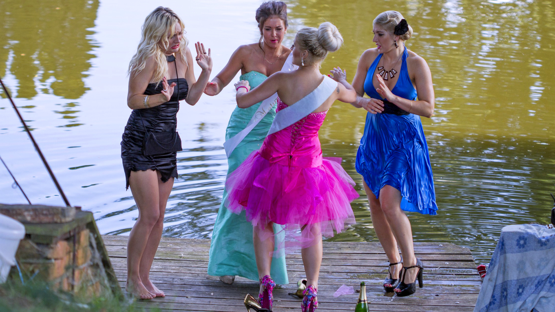 Four gorgeous beauty pageant contestants, three blondes and a brunette, are celebrating their victory together, sharing champagne on a picnic table in the woods, near a lovely lake. They look flawless with their hair and makeup done perfectly, in high heels, wearing long formal dresses with sashes. They decide to take a casual stroll to a nearby...